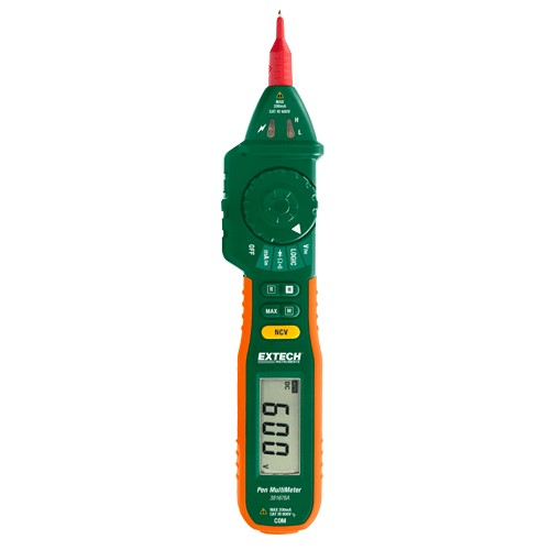 The Extech 381676A is a Pen Styled Multimeter with a Built-in NCV detector. The 381676A features nine functions including AC/DC voltage to 600V, AC/DC Current to 200mA, Resistance, as well as Logic, Diode and Continuity Tests. This meter has an easy-to-use rotary dial with alligator clips for one-handed operation. Its convenient built-in non-contact voltage detector allows for quick detection of live voltage.