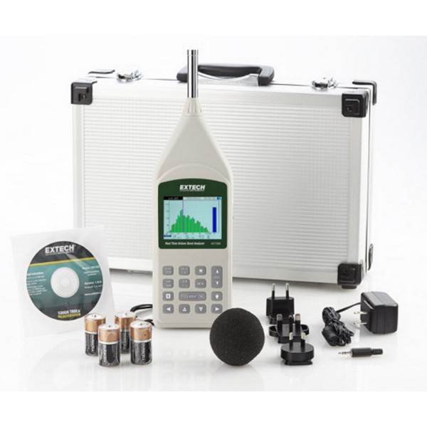 Extech's Type 2 Integrating Sound Level Meter with Octave and 1/3 Octave Band Real Time is displayed on a large 3.5" 320x240 TFT color backlit LCD.