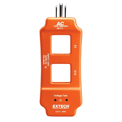 This Extech 480172 Line Splitter provides a fast and easy way to"open" standard 120 Volt AC electrical lines, eliminating the need to cut off the plug and separate the conductors. When connected between a 120 Volt AC outlet and a device under test, this splitter separates the hot/live conductor from the neutral and ground, which enables users to measure AC current up to 15 Amp on a two-wire or three-wire lines using a clamp meter. This splitter also features two Voltage Test jacks so that voltage can be measured using a multimeter.