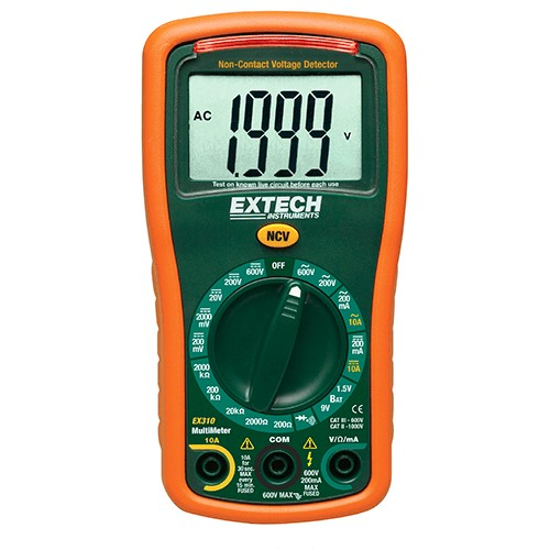 The EX310 is a compact manual ranging multimeter which features an extra-large 2000 count display and a built-in non-contact AC voltage detector (NCV). AC/DC Voltage and Current, Resistance, Diode/Continuity measurements. Includes battery test function (1.5 Volt and 9 Volt). A rubber holster protects the meter. UL listed Cat III - 600 Volt safety rating.