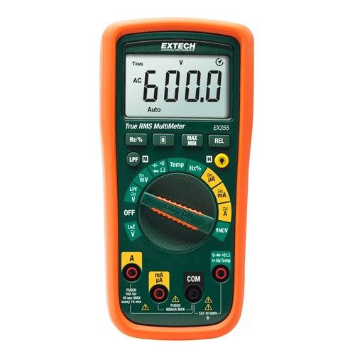 The EX355 is a professional DMM loaded with advanced features and functions. The low impedance (LoZ) mode eliminates false readings caused by ghost voltages. Low Pass Filter (LPF)attenuates high frequencies to reduce noise for accurate readings. True RMS provides accurate readings when measuring distorted or noisy waveforms. Built-in Non-Contact AC Voltage Detector quickly checks for the presence of AC Voltage before testing. Features a 6000 count LCD Display, data hold, min-max, relative mode, capacitance zero, Auto Power-Off, continuity, and diode test. This meter will measure AC/DC voltage to 600 V and AC/DC current to 10 amps.