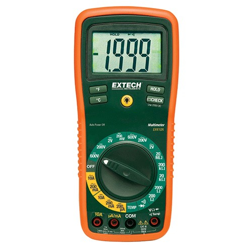 Compact and powerful, the Extech EX410A Eight-Function True RMS Professional MultiMeter provides the versatility of multiple meters in one convenient device. The EX410A measures AC/DC voltage and current, resistance, diode, and temperance. A large, backlit display and 1-inch high digits allow for easy reading, while the ergonomically designed housing offers comfortable, one-handed operation.