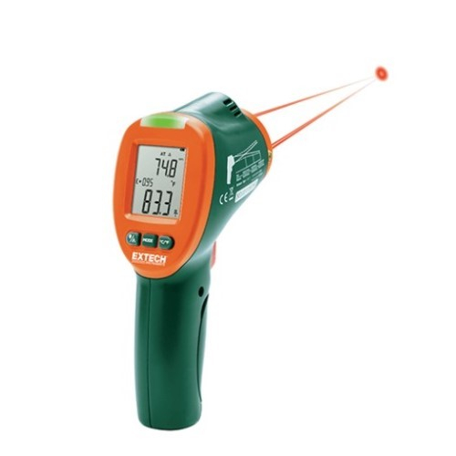 The IRT600 is a Dual Laser IR Thermal Condensation Scanner. This 12:1 Infrared Psychrometer with 3-Color LED Dew Point Alarm measures temperature and humidity then calculates Dew Point and warns the user when conditions for mold growth exist. Great for processes that require surface temperature control and monitoring. Green LED changes to Yellow and then to Red as the surface temperature reading gets closer to and then equals the calculated Dew Point reading