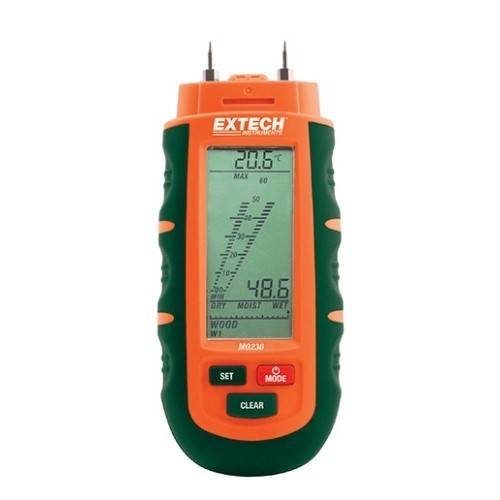This large dual graphical LCD displays moisture in wood and other building materials plus Air Temperature and Relative Humidity. Unique LCD with analog bargraph for simultaneous digital readout of moisture content plus ambient temperature or humidity with analog bargraph display of moisture, minimum/maximum moisture values, and programmable wet/dry indication. Use on wood, paper, wallboard, sheet rock, cardboard, plaster, concrete, and mortar. Memory contains 3 wood groups and four building material groups with calibrations for approximately 150 species of wood and 19 building material types. Index Mode with programmable high and low values that can be used to quickly locate moisture with comparative measurement. Replaceable threaded electrode pins, impact proof housing, Auto power off conserves battery energy, built-in battery check and measurement verification test.