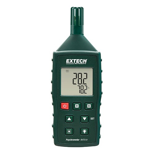 Conveniently check the Humidity and Temperature conditions in residential and professional settings to ensure comfort and safety. The RHT510 is a Hygro-Thermometer Psychrometer that measures Relative Humidity, Temperature, Dew Point, and Wet Bulb. General-purpose bead wire Type K probe is included for measuring Temperature up to ~480°F (250°C), while the meter can measure to 2372°F (1300°C) if used with other probes. Min/Max function stores and recalls highest and lowest readings.