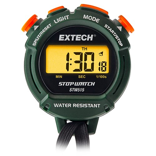 Extech's STW515 is a digital stopwatch and clock. This stopwatch features a 12 or 24-hour clock format and programmable alarm with hourly chime. It also has three Stopwatch Modes: Elapsed Timer, Split Time, and Two Competitor Timer. The backlight can be used for viewing at night or in dimly lit areas and turns off automatically after five seconds.