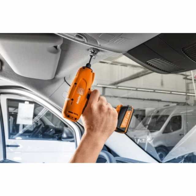 Parameterisable cordless screwdriver with mechanical shut-off clutch for industrial use.