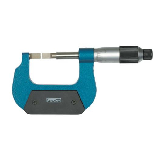 Use Fowler No. 52-246 Blade Micrometers to measure the outside diameter of workpieces which have narrow grooves, "T" slots and other dimensions blocked by shoulders or lands where standard type micrometers cannot be applied.