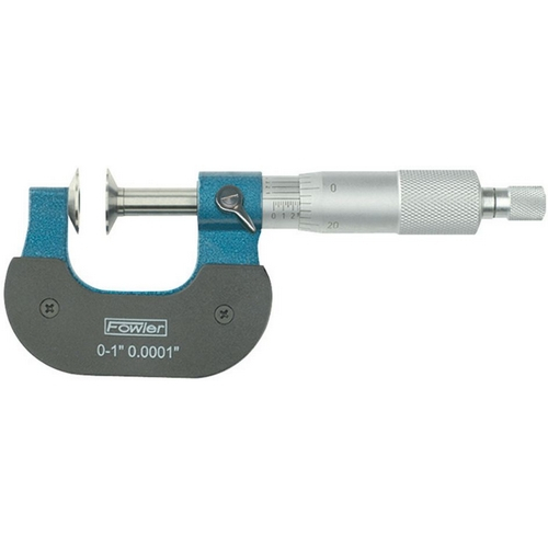 Fowler Disc Micrometers simplify measuring thickness of difficult, closely spaced sections, ribs, keys, fins, cutting edges on forming tools, chordal thickness of gear teeth and more. The extra large diameter disc will enter normally inaccessible places such as narrow grooves, slots and recesses.