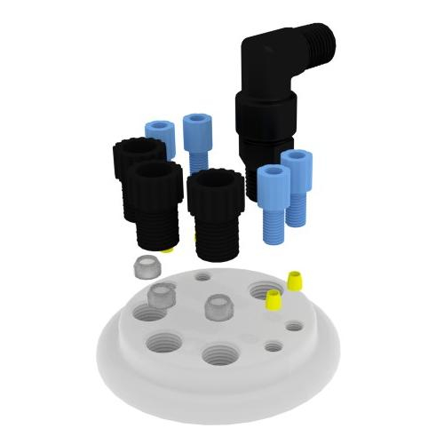 - Tube fittings secure waste tubes to carboy providing the closed system necessary to prevent spills (plugs included for unused ports)