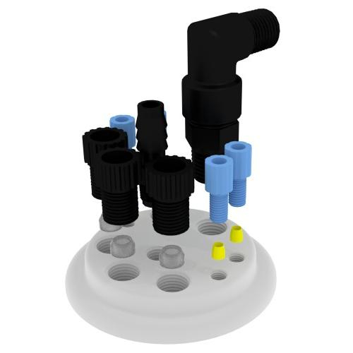 - Tube fittings secure waste tubes to carboy providing the closed system necessary to prevent spills (plugs included for unused ports)