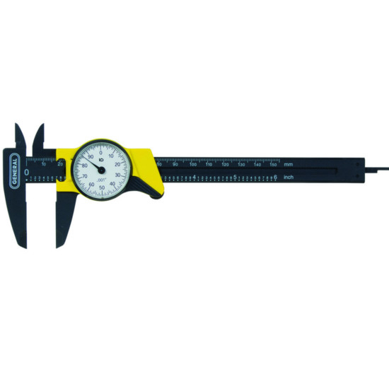 The #145 6 In. Plastic Dial Caliper, Single Revolution can make inside, outside, depth and step measurements in inches or millimeters.
