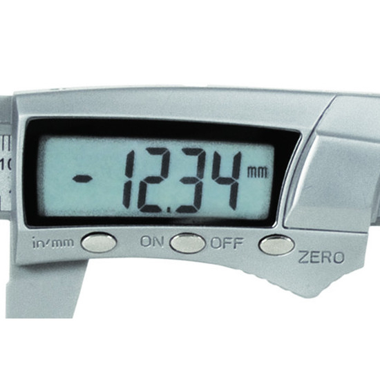 The #146 6 In. Carbon Fiber Digital Caliper can make inside, outside, depth and step measurements in inches or millimeters.