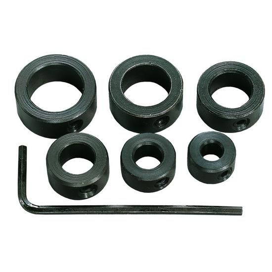 The #S838 Drill Stops, Six Assorted prevent excessive penetration of twist and brad point drill bits.