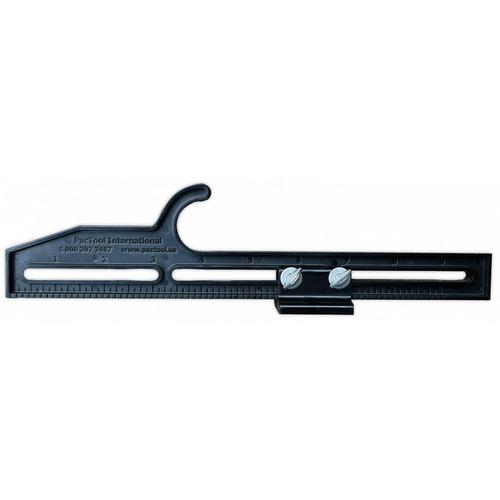 The PacTool Face Gauge is a handy, economy-minded tool for keeping siding and shingle reveals accurate. The adjustable slider shoe allows 1/8”-9” (.5-23.5cm) reveals, while a hook-shaped handle provides a comfortable sure grip and solid support. A V-notch on the back of the slider shoe turns the Face Gauge into a convenient compass for marking circular cuts. It also works as a handy scribing tool for marking or cutting.