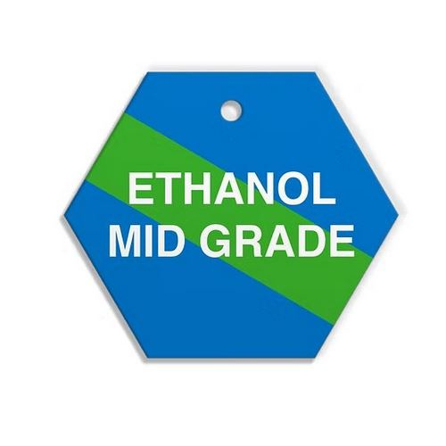 CPPI "Ethanol Mid Grade" plastic fuel type identification plastic tags are commonly displayed on fuel tank trailers, and vehicles to help both identify products and prevent mixing. Easily identify different categories of petroleum such as aviation products, middle distillates, heavy fuel oils, lubricating oils and solvents by utilizing recognizable shapes. Made from a thick 0.055" high-density polyethylene plastic 2.56" diameter hexagon (6.5cm) tag with a 0.3" (7.5mm) drilled hole.