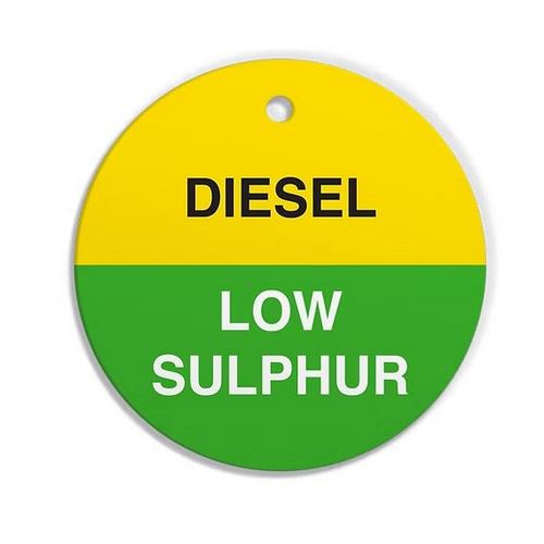 CPPI "Diesel Low Sulphur" plastic fuel type identification plastic tags are commonly displayed on fuel tank trailers, and vehicles to help both identify products and prevent mixing. Easily identify different categories of petroleum such as aviation products, middle distillates, heavy fuel oils, lubricating oils and solvents by utilizing recognizable shapes. Made from a thick 0.055" high-density polyethylene plastic 2.56" diameter circle (6.5cm) tag with a 0.3" (7.5mm) drilled hole.