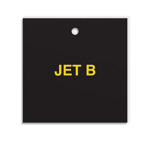CPPI "JET B" plastic fuel type identification plastic tags are commonly displayed on fuel tank trailers, and vehicles to help both identify products and prevent mixing. Easily identify different categories of petroleum such as aviation products, middle distillates, heavy fuel oils, lubricating oils and solvents by utilizing recognizable shapes. Made from a thick 0.055" high-density polyethylene plastic 2.36" square (6.0cm) tag with a 0.3" (7.5mm) drilled hole.
