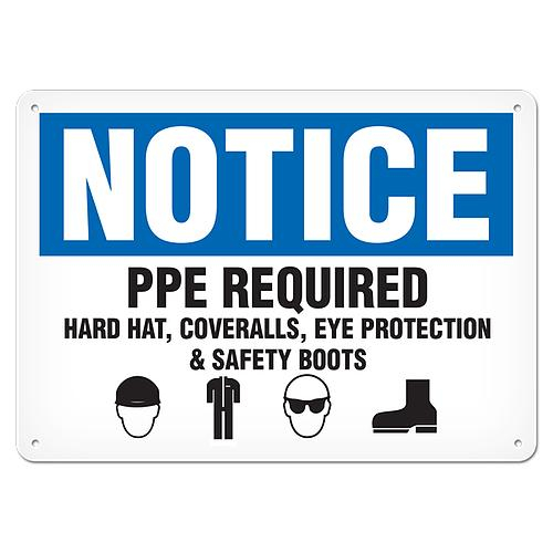 Incom, SA4063P, 7" x 10" Semi-Rigid Plastic Sign "Notice - PPE Required, Hard Hat, Coveralls, Eye Protection and Safety Boots"