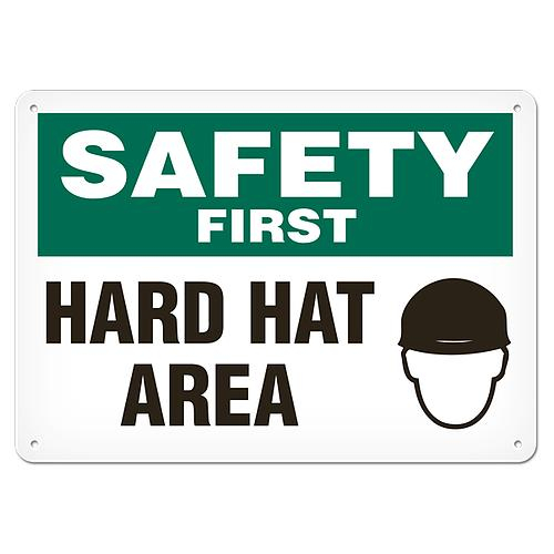 Incom, SA5010P, 7" x 10" Semi-Rigid Plastic Sign "Safety First - Hard Hat Area"