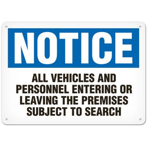 Incom, SC4008A, Sign "Notice - All Vehicles And Personnel Entering Or Leaving The Premises Subject To Search", 14" x 20", Aluminum