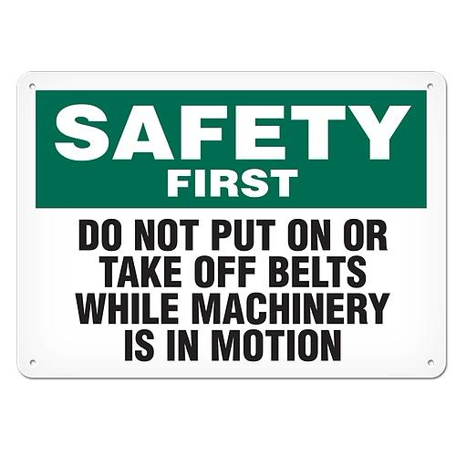 Incom, SC5027V, Safety First Sign "Do Not Put On Or Take Off Belts While Machinery Is In Motion" 14" x 20" Adhesive Vinyl