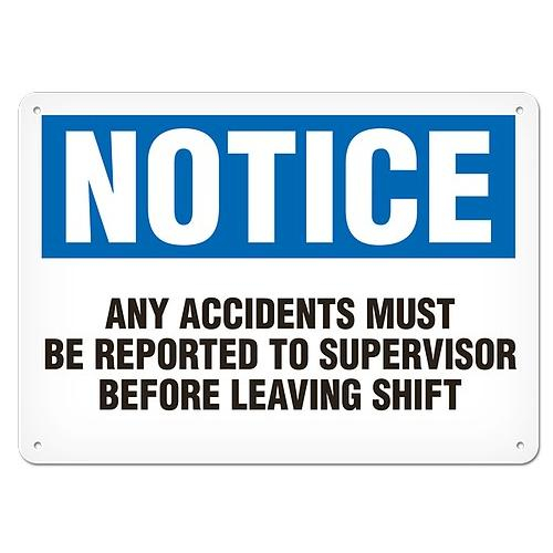 Incom, SS4007P, Semi-Rigid Plastic Sign "Notice - Any Accidents Must Be Reported To Supervisor Before Leaving Shift", 10" x 14"