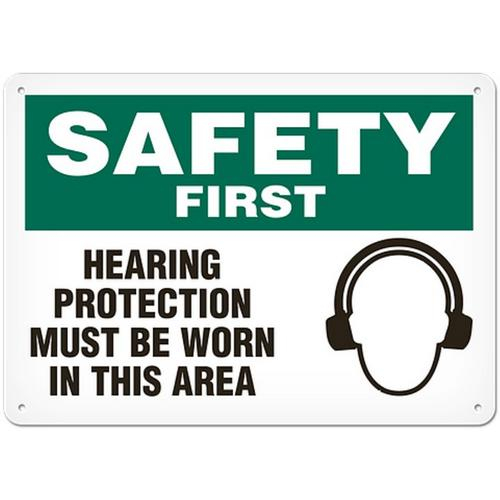 Incom, SS5009A, Sign Safety First "Hearing Protection Must Be Worn in This Area", Aluminum, 10" x 14"