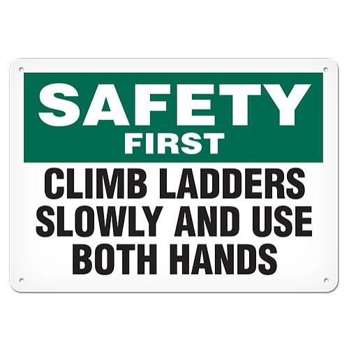 Incom, SS5031P, Sign "Safety First - Climb Ladders Slowly and Use Both Hands", 10" x 14", Semi-Rigid Plastic