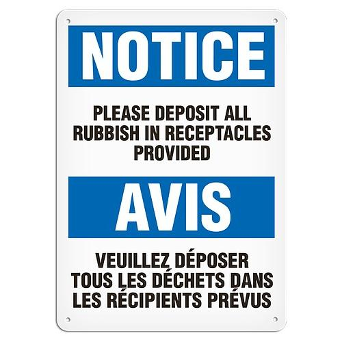 Incom, SS6027AL, 10" x 14" Aluminum with UV Lamination Sign "Bilingual Notice - Please Deposit All Rubbish In Receptacles Provided"