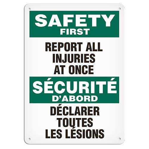 Incom, SS6032V, 10" x 14" Adhesive Vinyl Sign "Bilingual Safety First - Report All Injuries At Once"