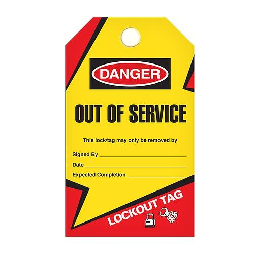 10-mil Poly Tag with 3/8" dia drilled hole. This Tag "are used to indicate that energy isolating devices are in use and the equipment being controlled may not be operated until the Lock Out/Tag "Out Device is removed. Tags include patented "Lightning Bolt" for drawing attention to the lockout area.