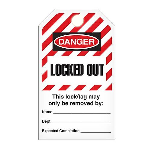 10-mil Poly Tag with 3/8" dia drilled hole. This Tag "are used to indicate that energy isolating devices are in use and the equipment being controlled may not be operated until the Lock Out/Tag "Out Device is removed. Tags include patented "Lightning Bolt" for drawing attention to the lockout area.