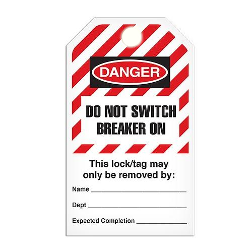 Incom, TG6034PT, Lockout Tag "Do Not Switch Breaker On", Hazard Stripe, Poly Tag, 3.3" x 5.7"