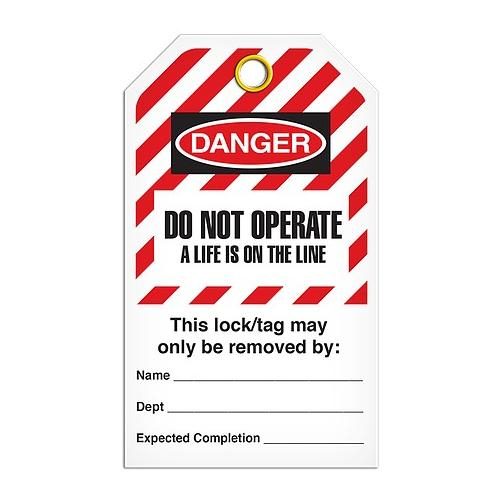 Incom, TG6041RP, Lockout Tag "Do Not Operate a Life is on the Line", Hazard Stripe, Rigid Duraply, 3.3" x 5.7"