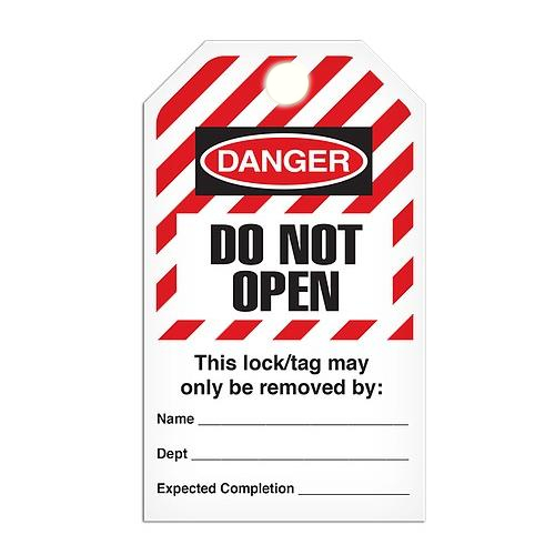 10-mil Poly Tag with 3/8" dia drilled hole. This Tag "are used to indicate that energy isolating devices are in use and the equipment being controlled may not be operated until the Lock Out/Tag "Out Device is removed. Tags include patented "Lightning Bolt" for drawing attention to the lockout area.