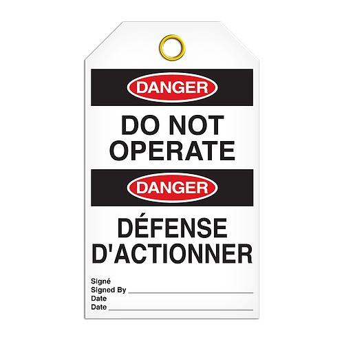15-mil Rigid Duraply with 3/8" dia metal eyelet. This saftey Tag "as a great way to communicate health and safety issues in a bilingual working environment
