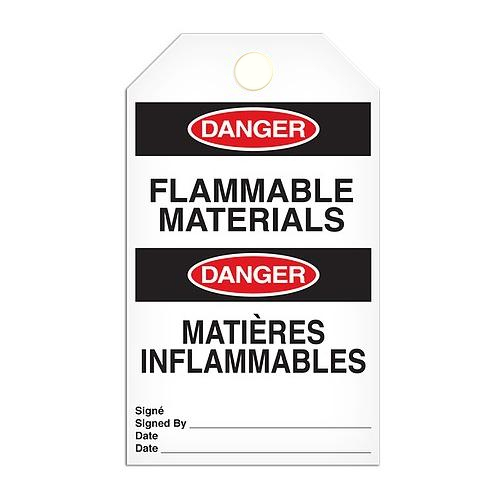 10-mil Poly Tag with 3/8" dia drilled hole. This saftey tag as a great way to communicate health and safety issues in a bilingual working environment