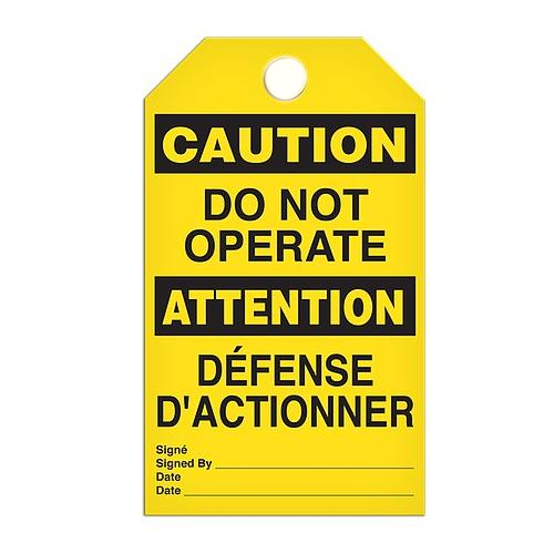 10-mil Poly Tag with 3/8" dia drilled hole. This saftey tag as a great way to communicate health and safety issues in a bilingual working environment