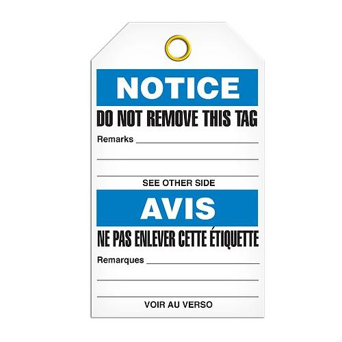15-mil Rigid Duraply with 3/8" dia metal eyelet. This saftey tag as a great way to communicate health and safety issues in a bilingual working environment
