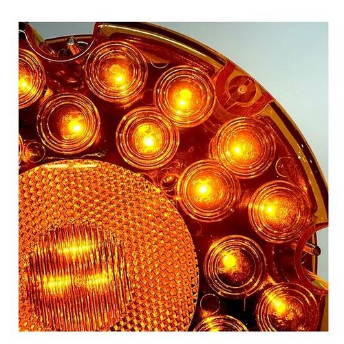 This is a set of two amber LED lights (7" OD) mounted to either side of a metal bracket. The lights have a foam gasket between the light and the bracket. This is a standard replacement part for an INCOM or previous Barpek style pilot car sign frame. Lights must be used in conjunction with a flasher (sold separately #TS8202) in order to flash when turned on. (12-volt electrical). Lights have wiring for medium (black & white wires) and high intensity (black & red wires) brightness options.