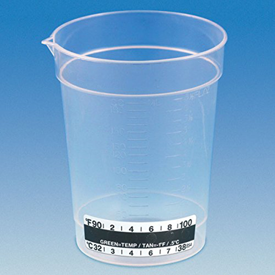 Globe Scientific, 5926, Specimen Container, 6.5oz, with Attached Thermometer Strip, Pour Spout, PP, Graduated