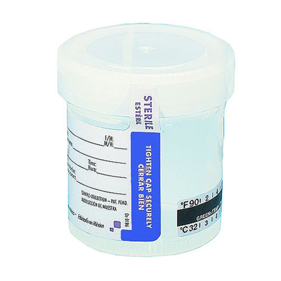 Globe Scientific, 6523TP, Container: Tite-Rite, 60mL (2 oz), PP, STERILE, Attached White Screw Cap, ID Label with Tab Seal, Graduated, Thermometer Strip