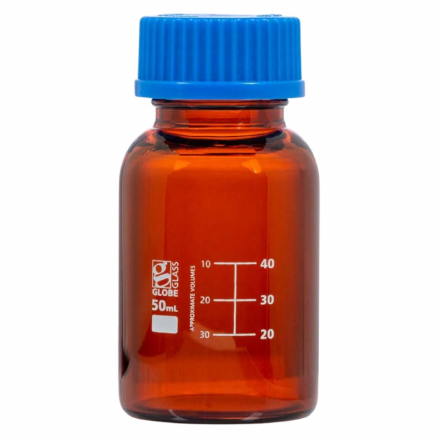 Globe Scientific, Globe Glass 50mL Amber Media Bottle, GL32 Screw Cap, Dual Graduations