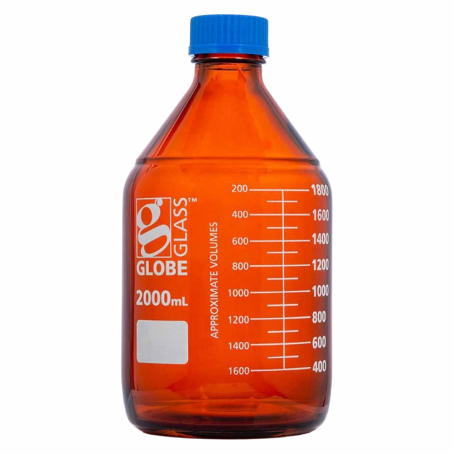 Globe Scientific, Globe Glass 2000mL Amber Media Bottle, GL32 Screw Cap, Dual Graduations