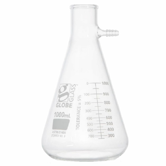 Globe Glass™ filter flasks meet ASTM E1406 specifications. Thick, heavy-duty walls provide the mechanical strength necessary for filtering operations. Flasks have side tubulation for connection to 7mm-8mm flexible tubing. Globe Glass filter flasks are designed with reinforced, beaded rims for strength and resistance to chipping.
