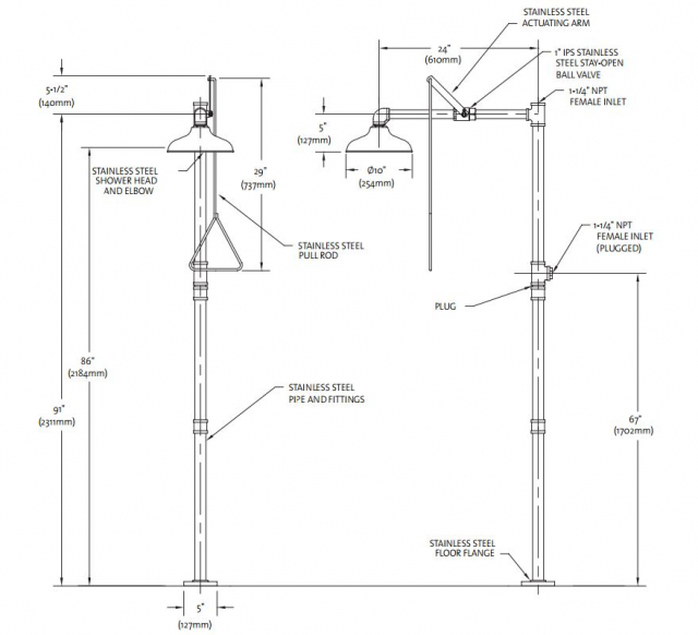 Application: Free standing emergency shower. Ideal for use in areas where highly corrosive materials are handled, as well as in laboratory and clean room applications.