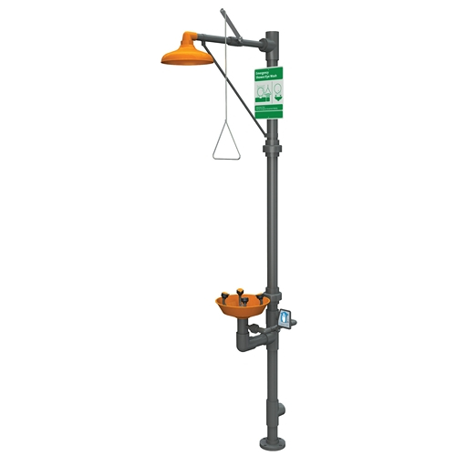 All-PVC combination WideArea Eye/ Face wash and shower safety station. Unit is constructed entirely of PVC and PVC-coated components for superior corrosion resistance. Ideal for industrial environments where harsh acids or caustics are present. Four GS-Plus spray-type outlet heads deliver a flood of water over a wide area of coverage for complete rinsing of eyes and face