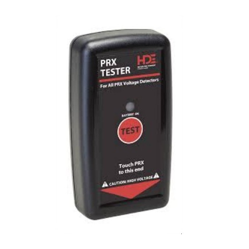 The PT-PRX Proof Tester Voltage Indicator Tester is for use on the PRX Proximity Voltage Detector. This tester generates high voltage AC for testing the PRX. To use, turn on the PRX and set it for the lowest range, hold the Tester in one hand and the PRX in the other. Apply the PRX SENSING ZONE end to the metal end plate on the Tester. Press and hold the TEST button on the Tester. A properly operating PRX will indicate voltage with continuous flashing lights and beeping sound. For best results, hold the PT-PRX with a tight grip and wrap your fingers around it. If the PRX does not indicate voltage, do not use it and return it to HD Electric Company for service.