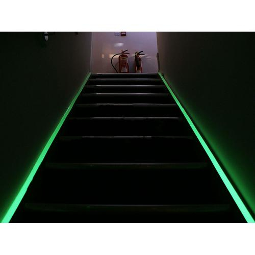 Egress photoluminescent tape is a smooth demarcation tape, used for marking areas in buildings to guide you during power outs or lights out situations. The glow in the dark properties are from photoluminescent powder applied to the base film. When the lights go out, the powder, which is full of photons that store energy from natural or artificial light, release this energy in a bright glow, guiding you down stairways, along walkways and through door ways and exits.